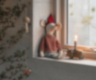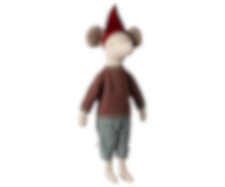 Adorable Christmas Mouse in a knitted shirt, blue pants topped off with a red pixy hat. Suitable for all ages.