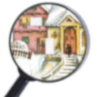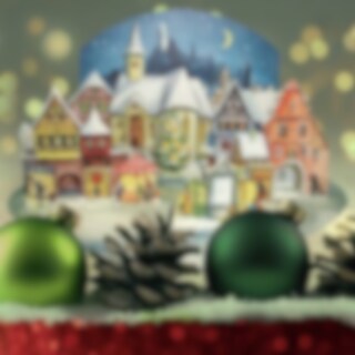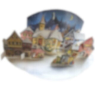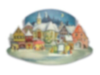 Foldable Christmas calendar with print of an old fashioned town at night, from year 1955.