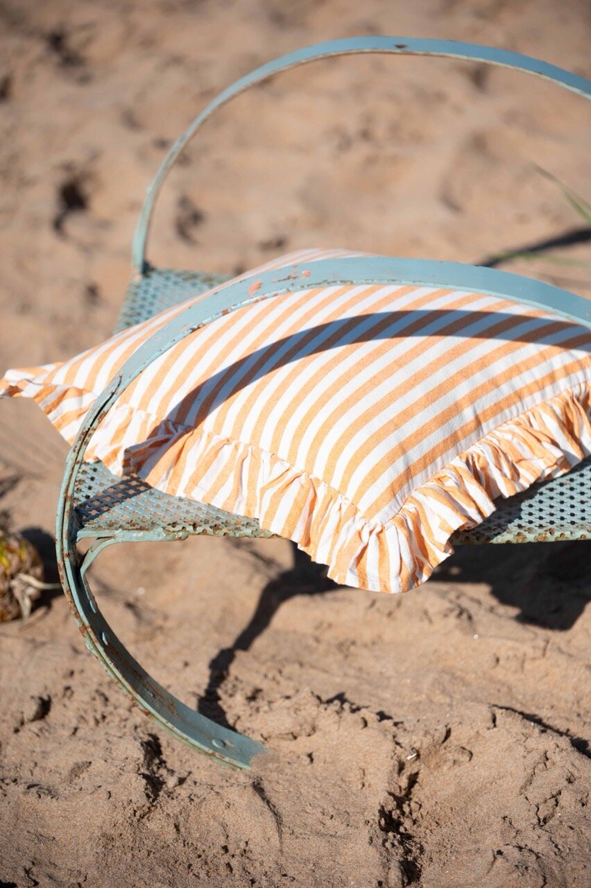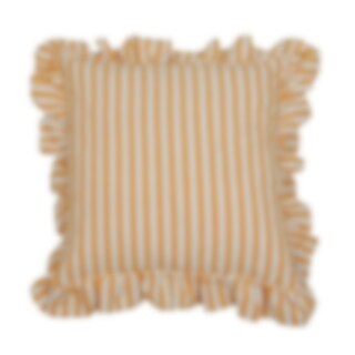 Cushion cover with classic yellow stripes and ruffled edges, made from recycled cotton and recycled polyester.