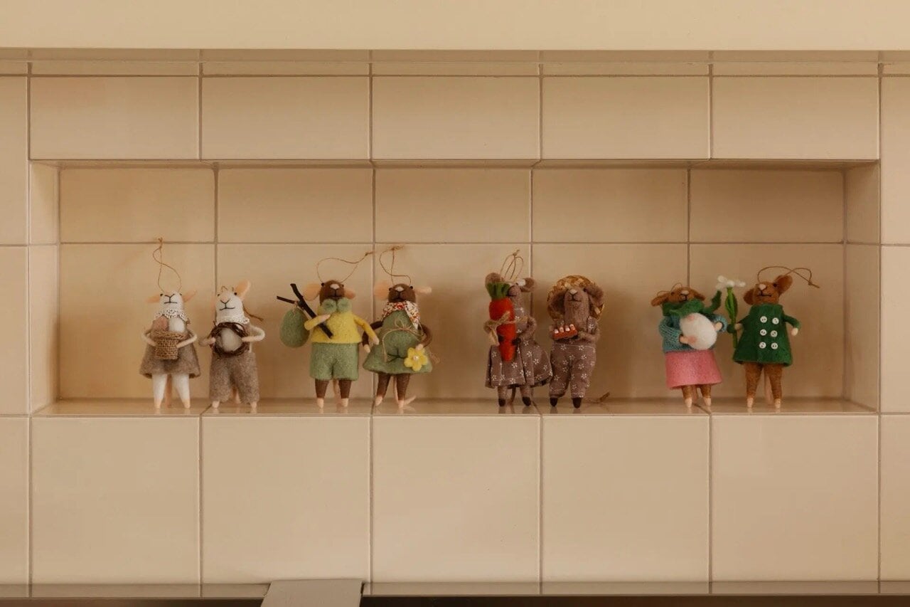 Tiny mice handmade in synthetic wool, a set of 2 different mice. Nice decorations to hang on a twig or in a garland in the window.