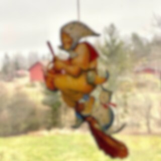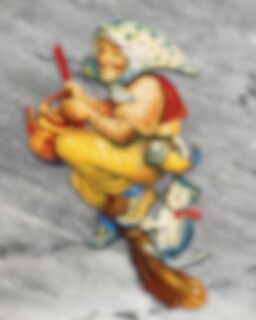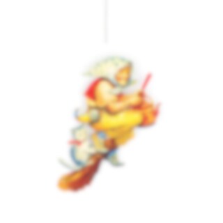 Double-sided Easter decoration in cardboard with an Easter witch on a broom with a kettle and a cat on the way to Blockula. Made in Sweden.