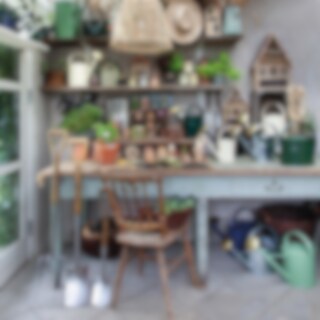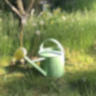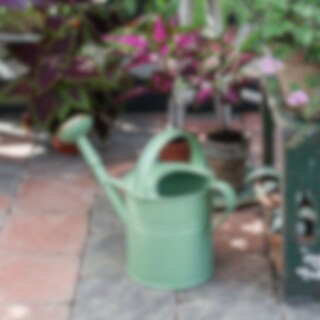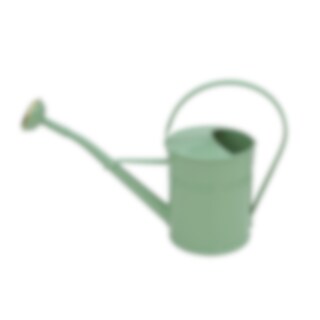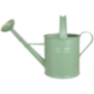 Decorative practical watering can with two-handed grip in a light green lacquered metal. Detachable watering can rose on the spout.
