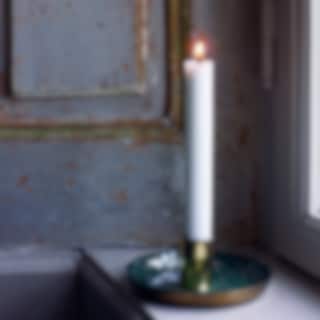 Candleholder in brass-coloured metal. The candle holder is extremely versatile due to its magnetic bottom part, and can be attached on eg metal trays. Suitable with regular taper candles.