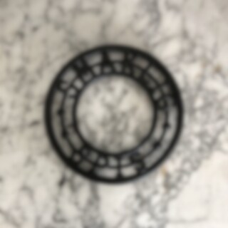 Round pot stand in black cast iron for pots and pans. Pattern that says "Smaklig Spis", Enjoy your meal!