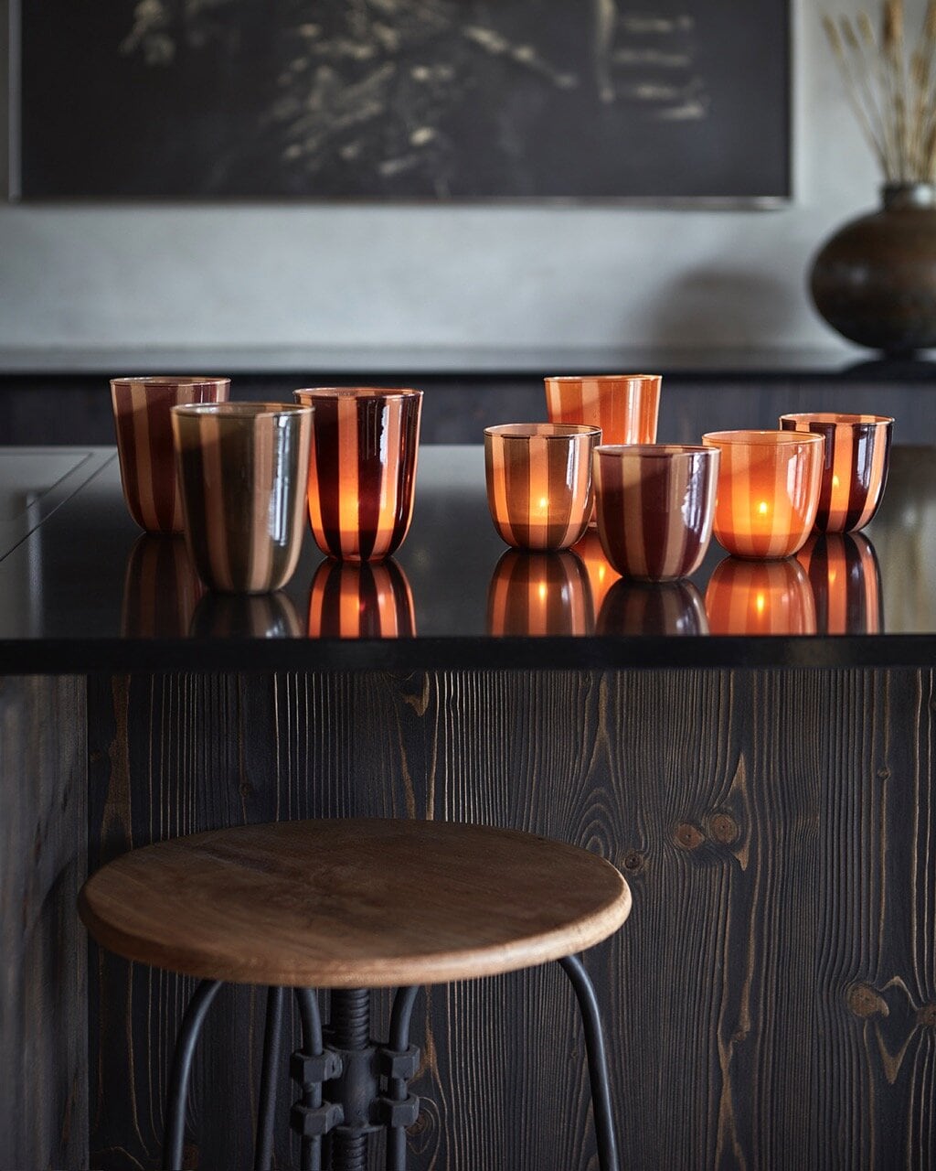 Small tea light holder in glass with beige and bordeaux stripes, suitable for tealights.