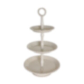 Beige three-tier cake stand with decorative dotted edges. Perfect as a cake platter or for serving at a buffet. Equipped with a handle on top for easy transport.