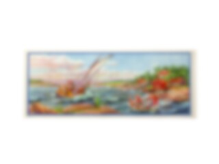 Genuine Old 50's! Old-fashioned wall tapestry in paper with a beautifully illustrated motif with boats on the lake.