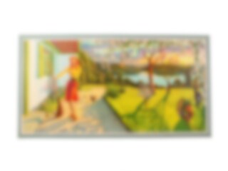 Old-fashioned paper tapestry by Jenny Nyström. The motif shows a woman sweeping her outdoor entrance, surrounded by chickens, a rooster and a hen. Around the motif there is a green frame.