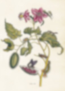 Lovely poster with motifs of butterflies and an annatto tree, with beautiful pink flowers and spiky fruits.