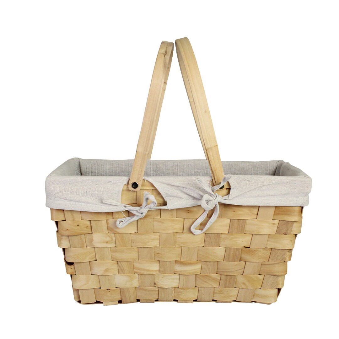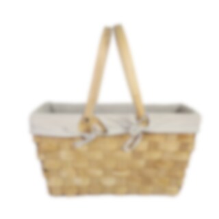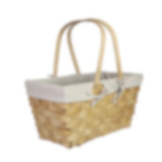 Natural colored wood basket with adjustable handles. The basket is carefully woven and lined with a soft white fabric on the inside. Perfect for a cozy picnic in the park, on the beach or in the garden.