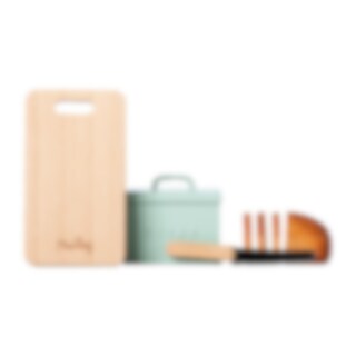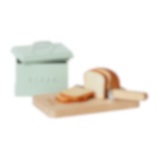 This miniature playset consists of a bread box, half bread and 3 slices, a cutting board, and a knife. It is made of metal, wood, and polyresin. It is the perfect start of a play in the miniature kitchen. Recommended from 3 years.