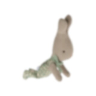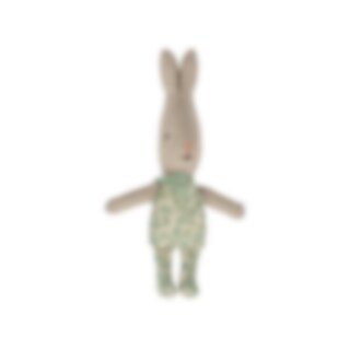 Little baby rabbit in a cute floral jumpsuit with green bow. Flower printed fabric with a cute bow in mint.