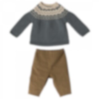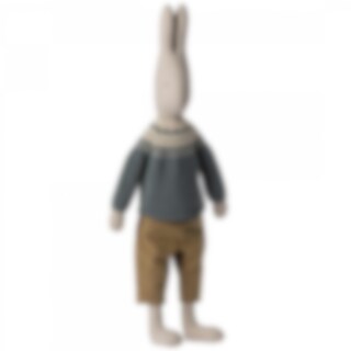An adorable bunny from Maileg, dressed in brown pants and a knitted blue sweater. The perfect friend for children to play with.