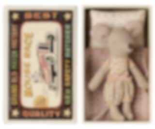 A classic Maileg item. This mouse is ready for hours of play and sleeps tight in a little matchbox. The clothes and bedlinen are made of soft fabrics with unique prints and beautiful colors. Bedlinen may vary in color. All ages.