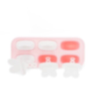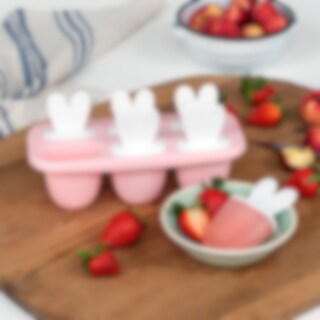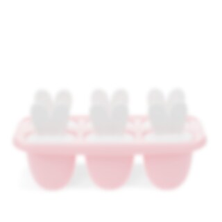 Cute and fun six-slot ice lolly mould in pink, with six lolly sticks in white. The lolly sticks feature hand grips shaped like bunny ears, perfectly suited to children's hands.