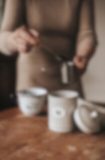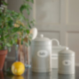Round tin in beige with a sign in white with the text Thé. From the tin series Hugo from Strömshaga.