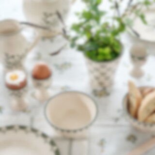 Egg cup in stoneware with an old-fashioned motif of a decorative clover pattern in green. Nice to combine and mix with the other motifs.