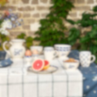 Egg cup in stoneware with an old-fashioned motif of a decorative check pattern in blue. Nice to combine and mix with the other motifs.