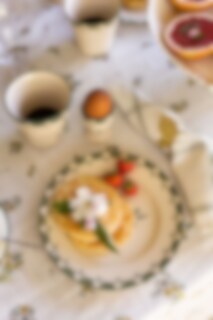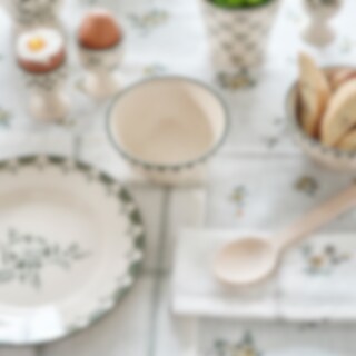 Plate in stoneware with an old-fashioned motif of a flower and decorative border. The pattern in the Marion series brings to mind the French countryside.