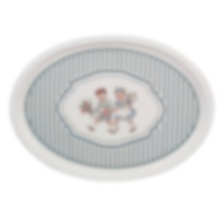 Oval tray in offwhite, with blue stripes and a charming motif of two children holding a bouquet of flowers. The tray is made of durable material with a smooth, easy-to-wipe surface. Can be wiped with a damp cloth.