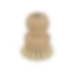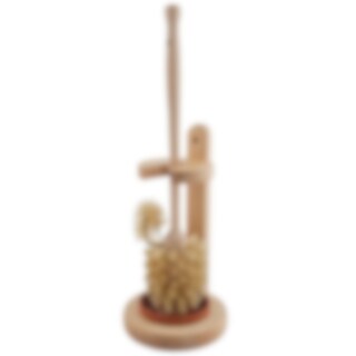 A toilet brush with edge cleaner and a wooden stand.