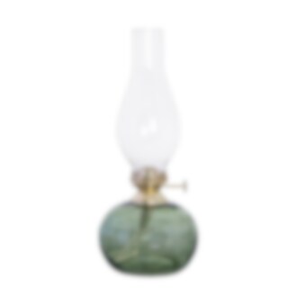 A beautiful round kerosene lamp in green glass with beautifully etched flowers, a brass burner, and a clear glass burner tube. This kerosene lamp conveys a nostalgic feeling reminiscent of times gone by, while fitting perfectly into modern interior settings.