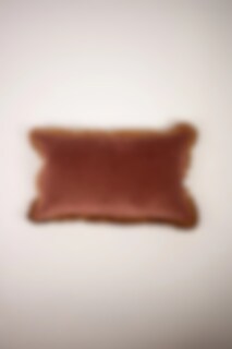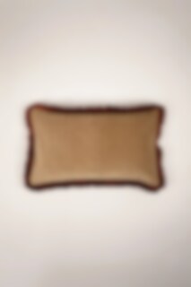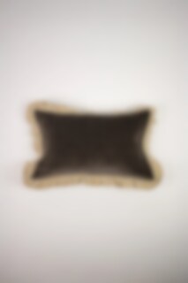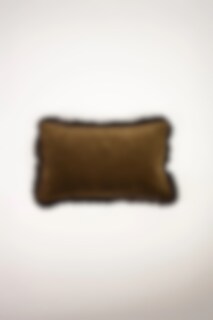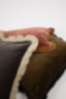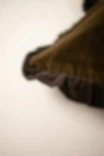 Lovely cushion cover in olive green velvet with brown ruffle.