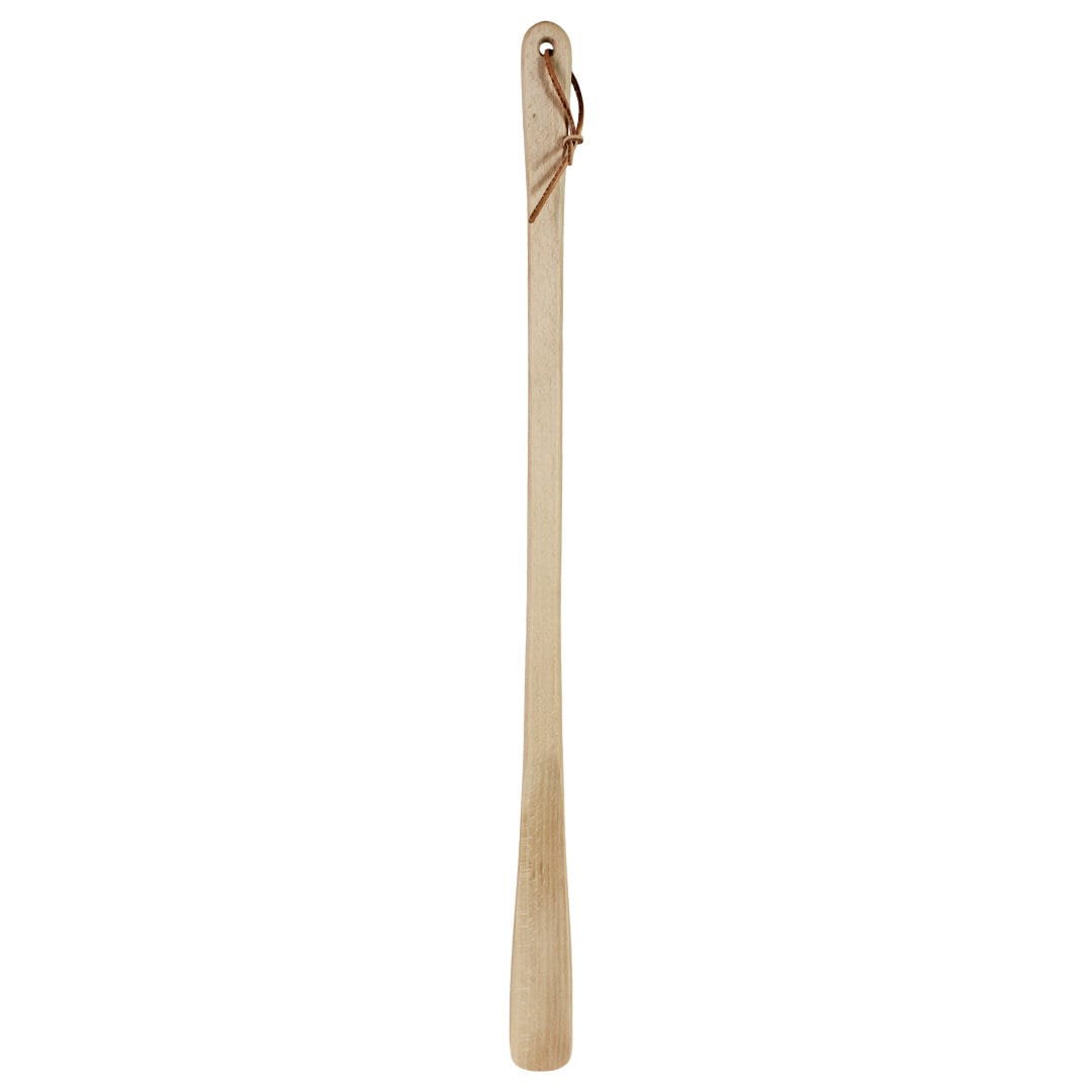 Large, classic wooden shoehorn made of FSC certified beech wood. Hole and leather band for suspension.