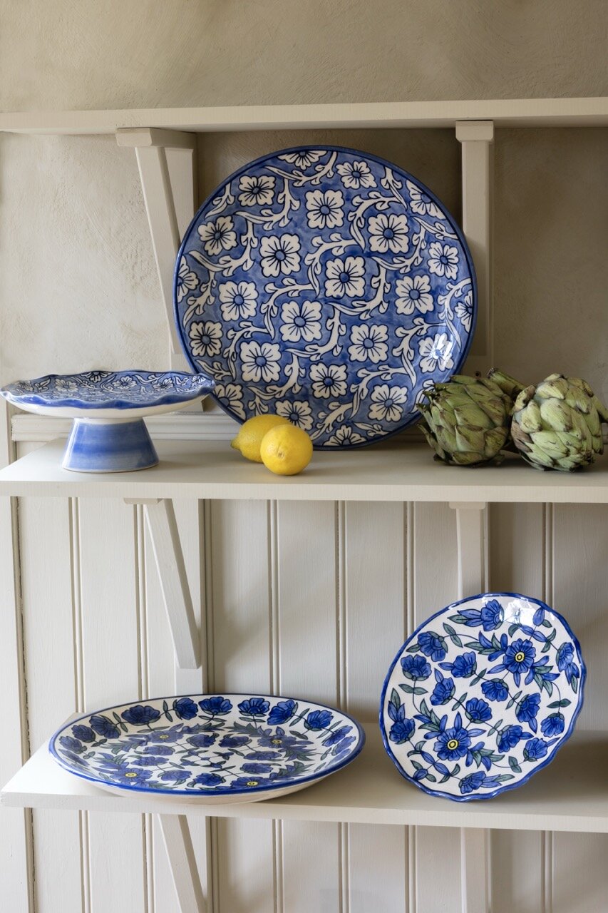Elegant ceramic serving platter adorned with a hand-painted floral pattern in a lovely blue hue. The platter is perfect for serving salads, pasta or other delicious dishes and adds a charming and colorful touch to the table.