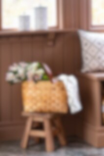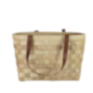Rectangular natural colored wood basket bag with two leather handles. Perfect to bring to the beach or the picnic.