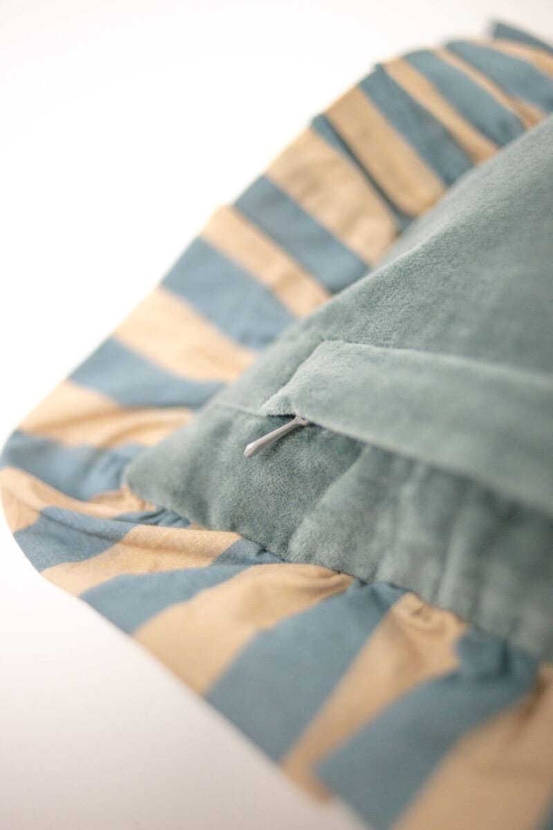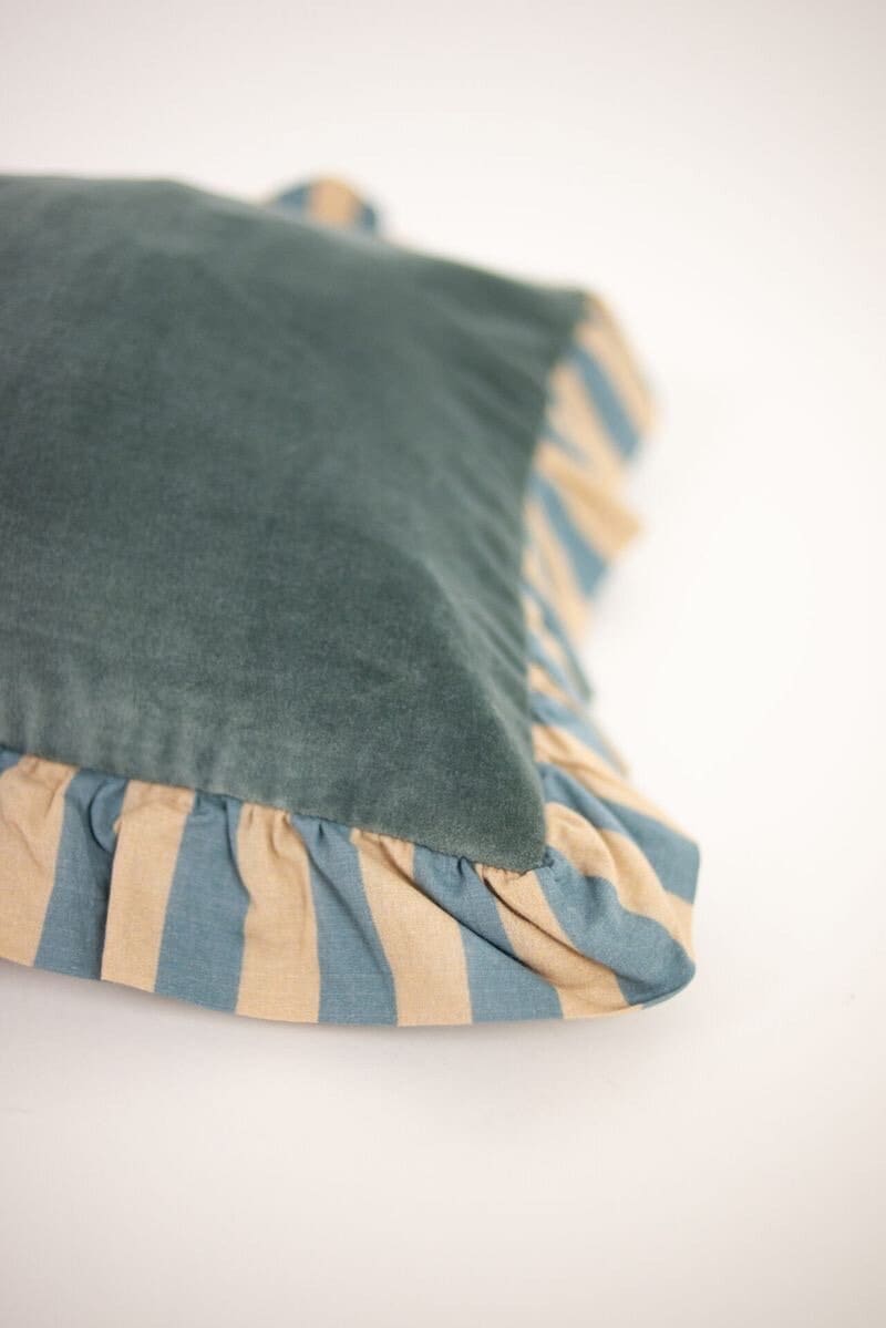 Lovely cushion cover in blue velvet with blue striped ruffle.