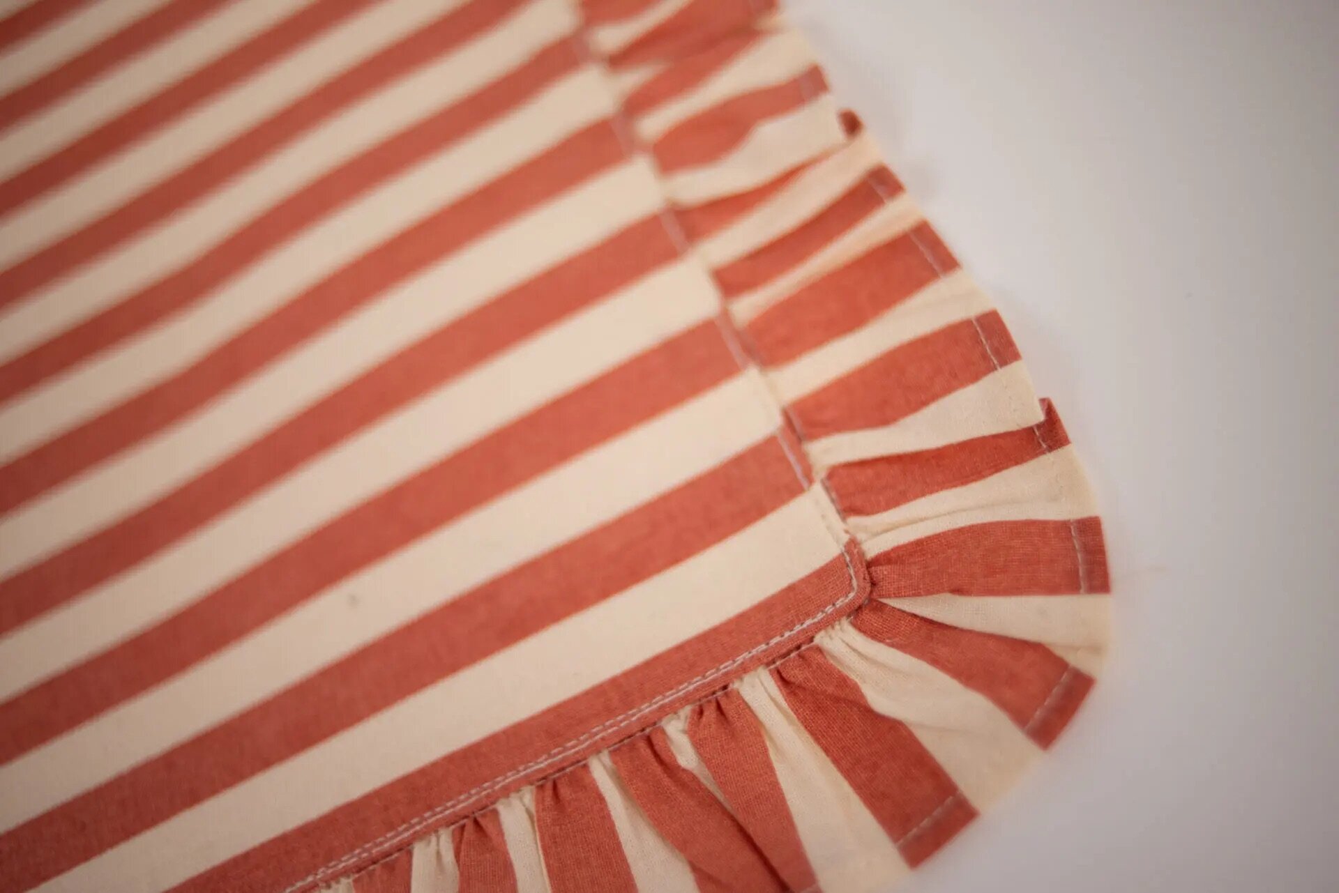 Striped placemat with decorative ruffle edge. A mix of romance, cool elegance and a cozy feel that elevates any table setting.