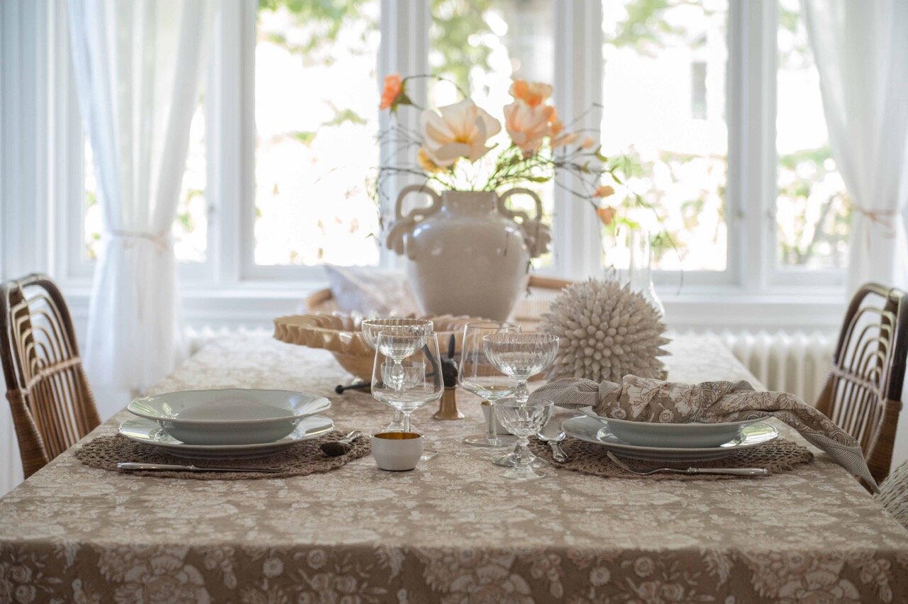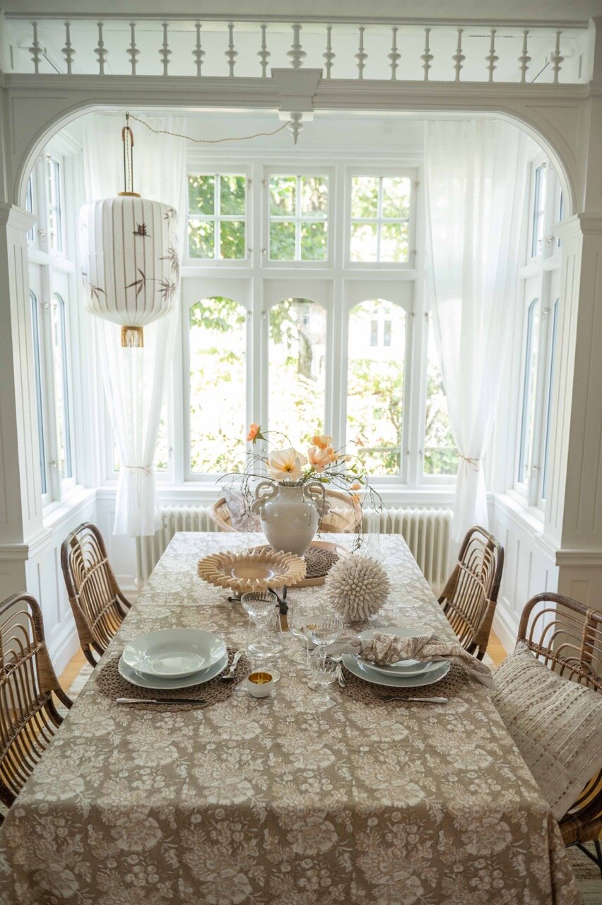 Cotton table cloth with a magnificent pattern and beautiful border along the long sides. A table cloth in soft colors that enhances the atmosphere of the room.