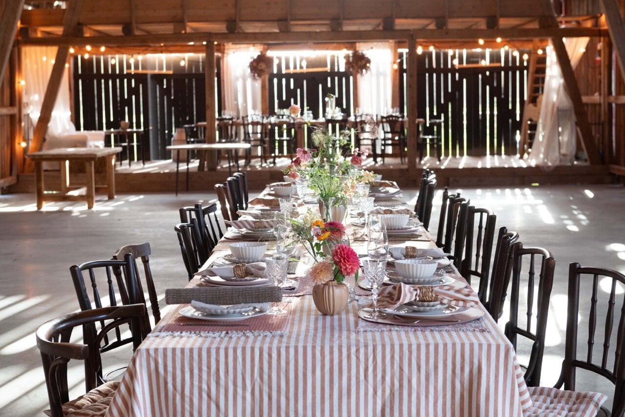 Lovely striped table cloth in a pink coloured shade. An elegant and stylish addition to your table setting.