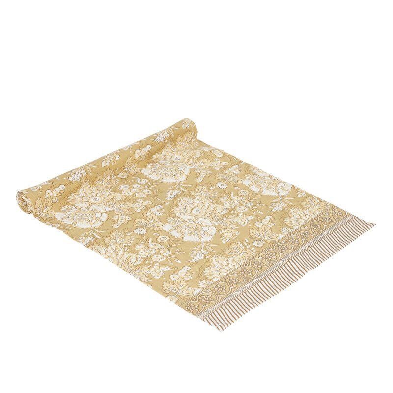 Cotton table runner with a magnificent pattern and beautiful border along the long sides. A table runner in soft colors that enhances the atmosphere of the room.