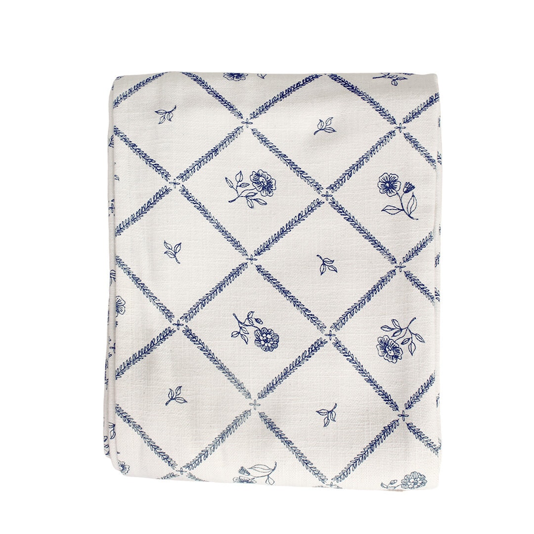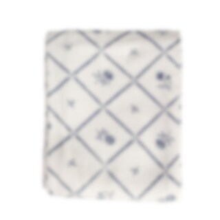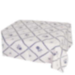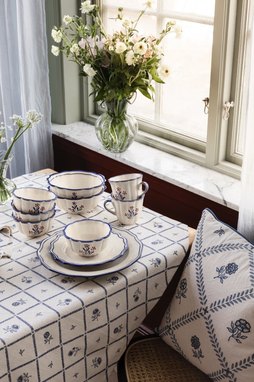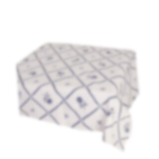 Table cloth in 100% organic cotton with a charming design of leaf squares and petite blue flowers. . Nice to combine with the other textile parts in the Lovisa series.