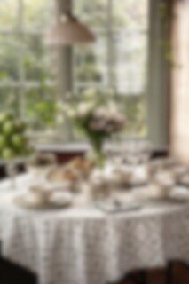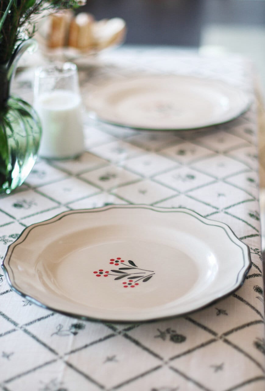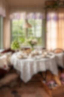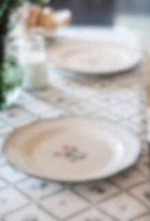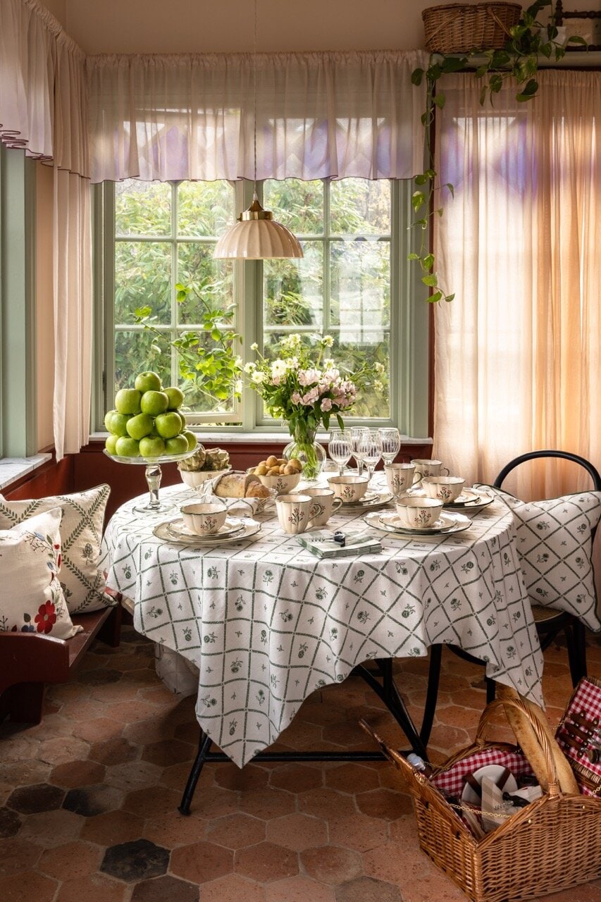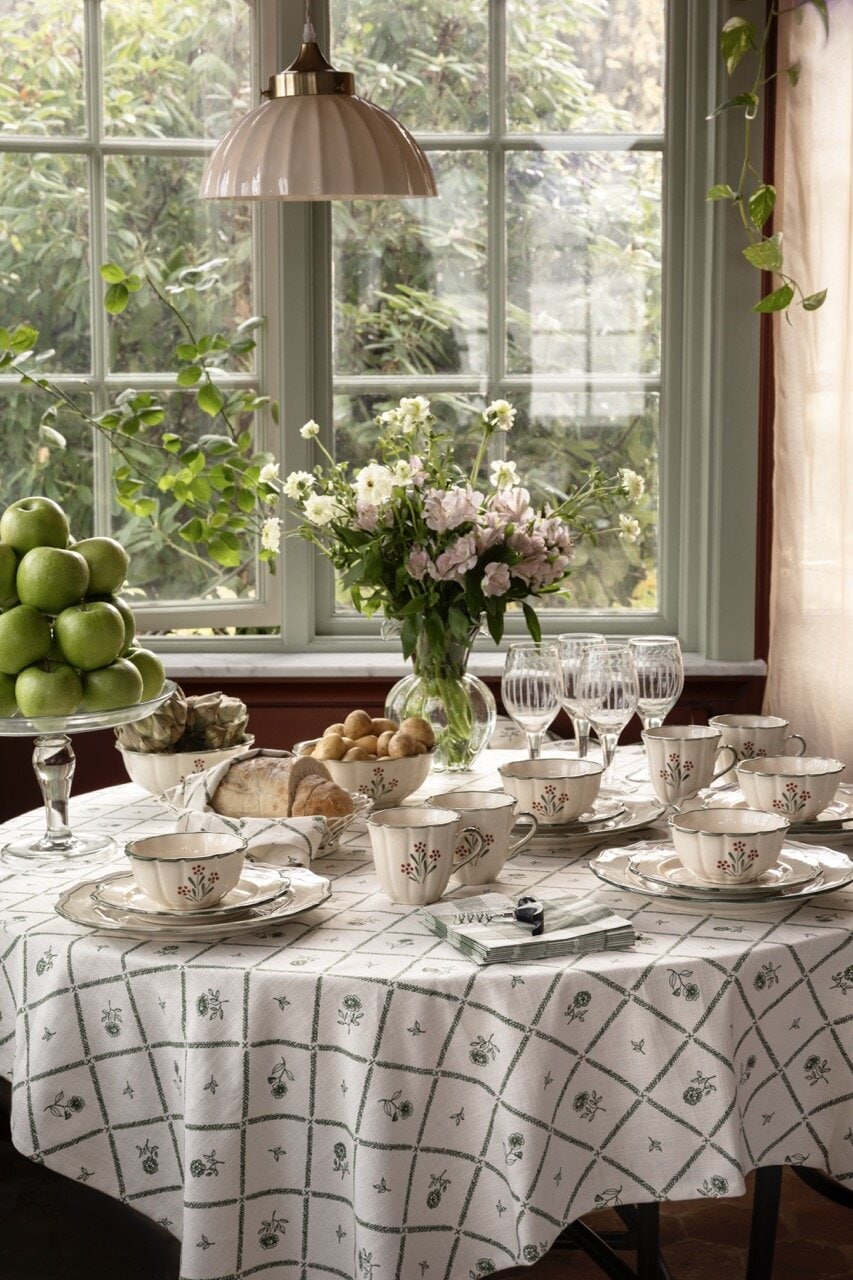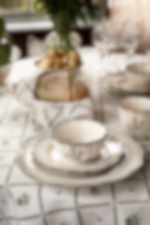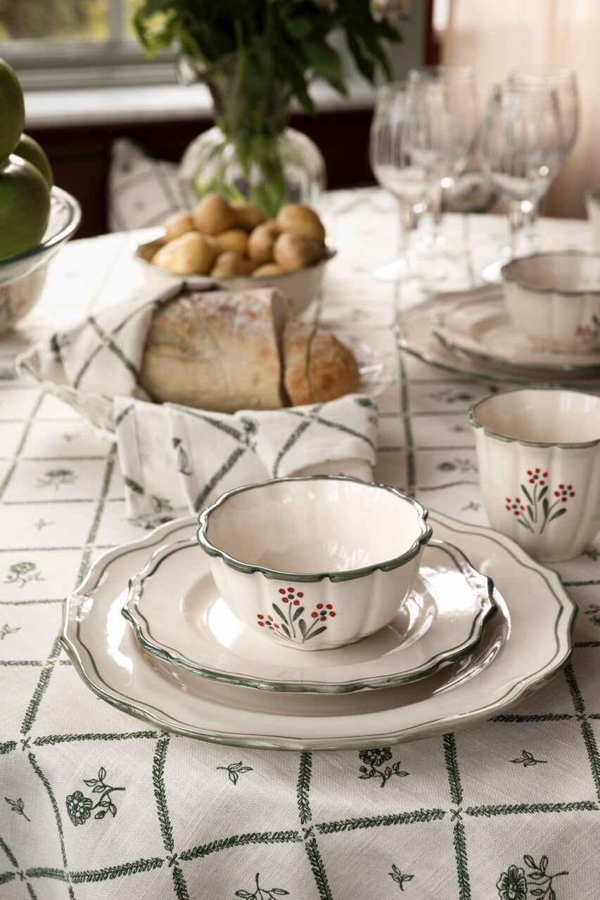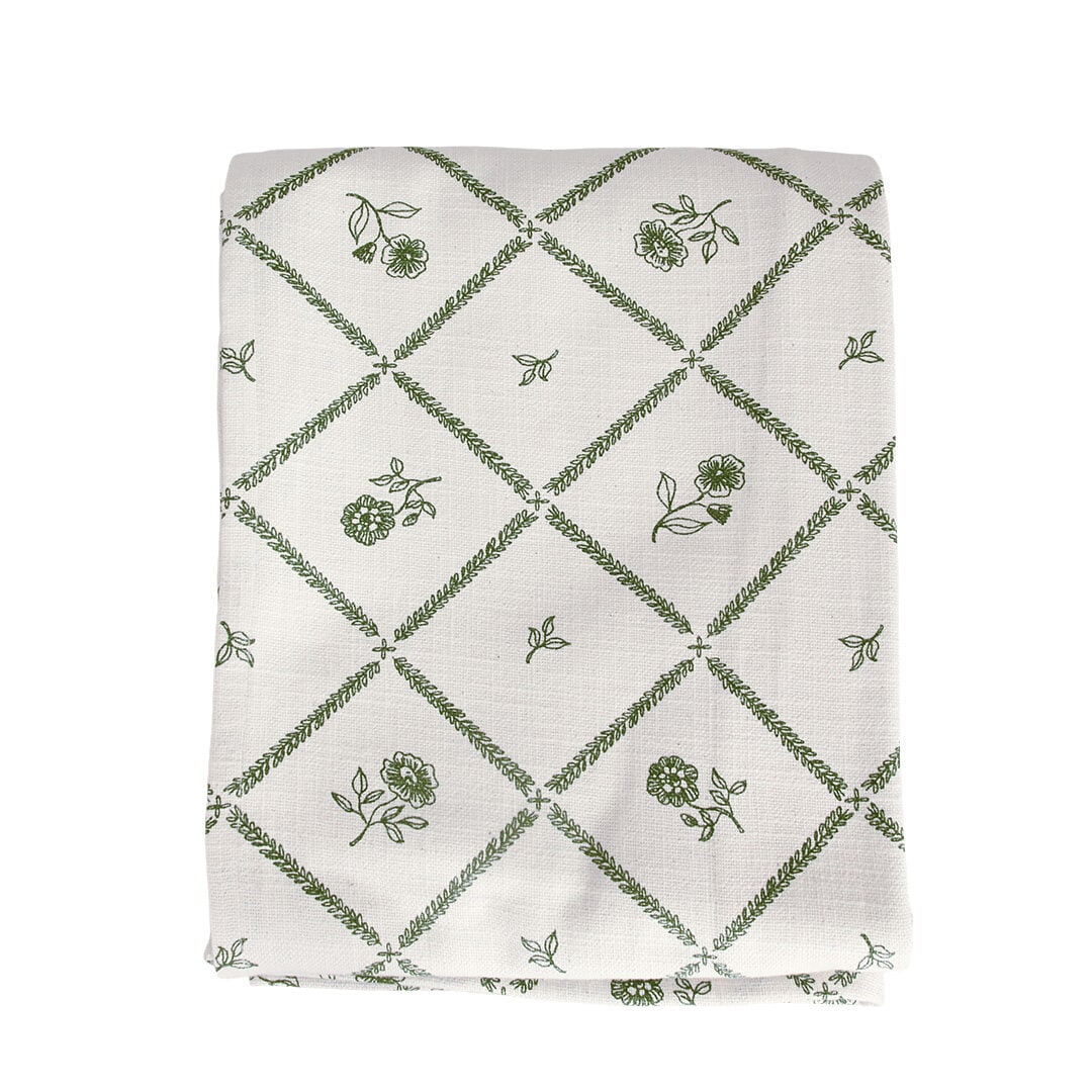 Table cloth in 100% organic cotton with a charming design of leaf squares and petite green flowers. Nice to combine with the other textile parts in the Lovisa series.
